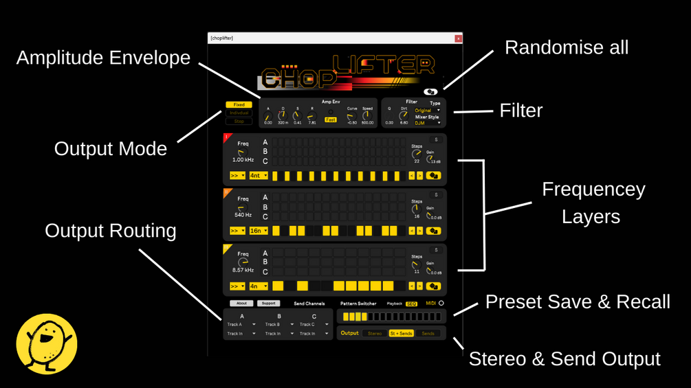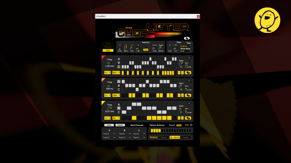 CHOPLIFTER processes any incoming audio signal across 3 frequency bands, each with their own gate sequencer and assignable outputs to 3 send channels.